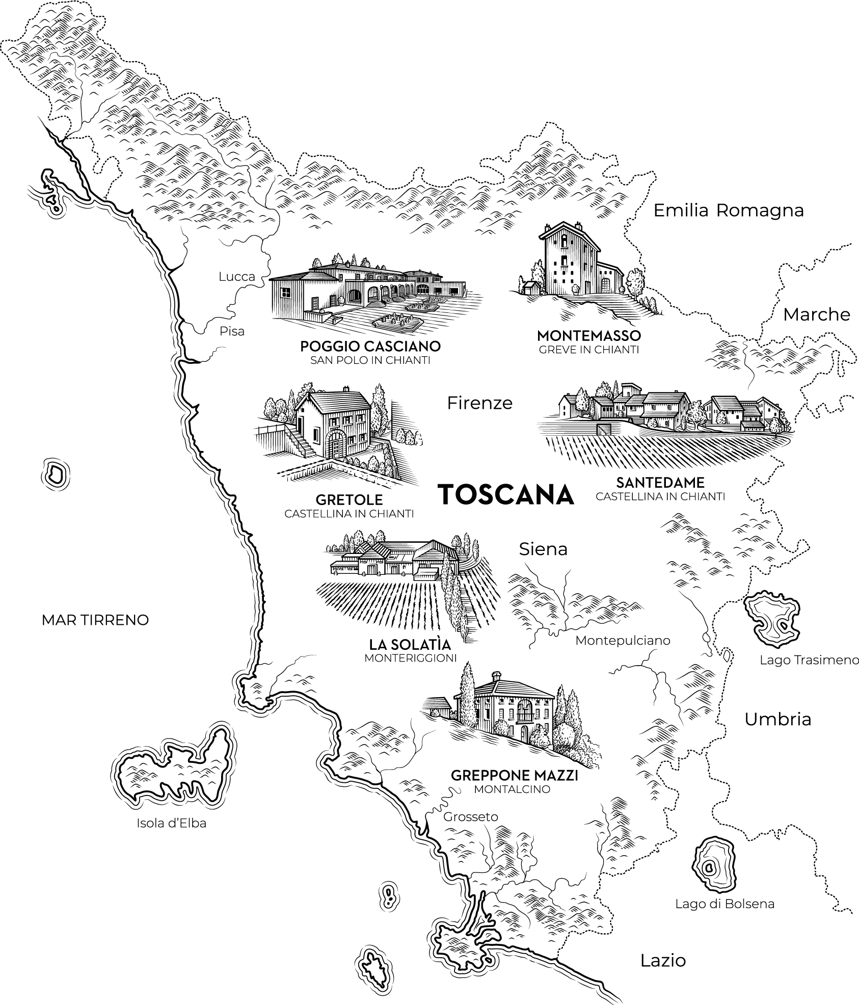 Magia w samym sercu Castellina in Chianti. Na obszarze 238 hektarów, z czego 110 to winnice, winorośle rosną na wysokości 230-290 metrów nad poziomem morza, na skalistej, kamienistej glebie idealnej dla winogron Sangiovese. Ta urokliwa posiadłość obejmuje uroczą kamienną willę oraz arcydzieło Riserva Ducale Oro Chianti Classico Gran Selezione. „Gretole” oddaje hołd kruchym skałom galestro, sekretowi Matki Natury, który zapewnia niezrównany smak win.